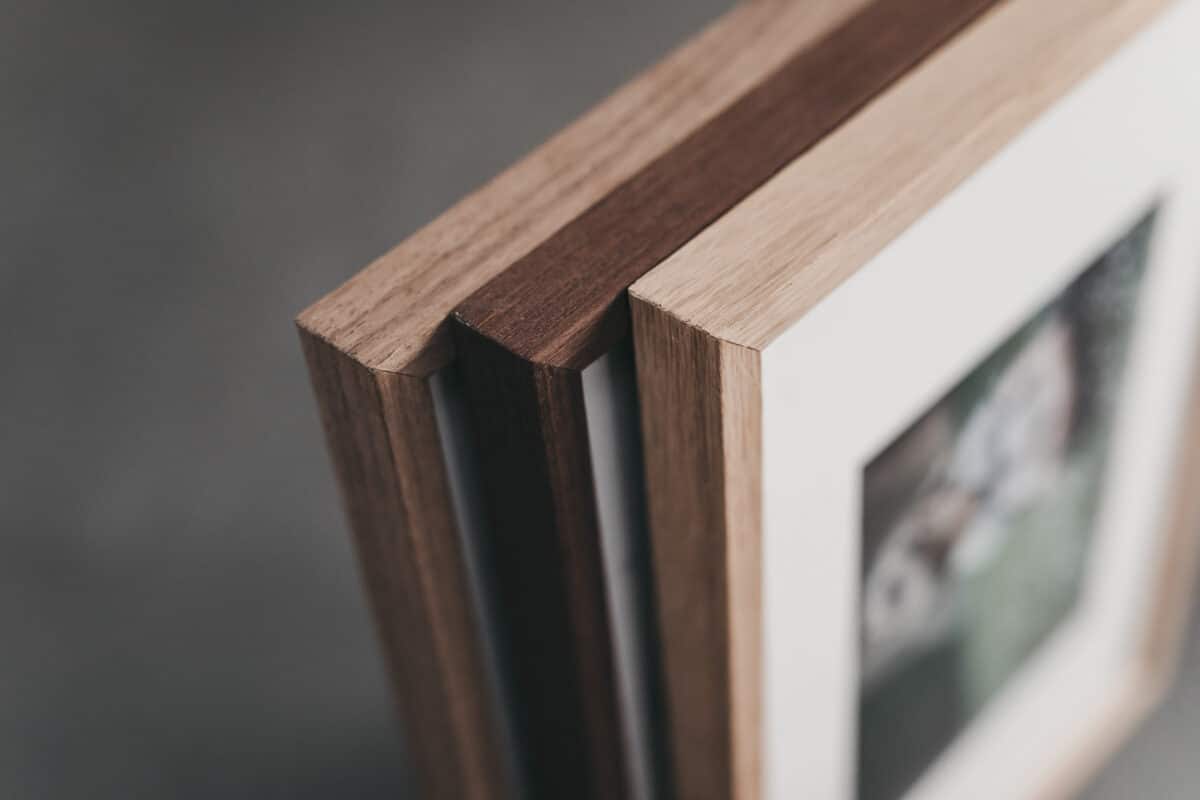 Skifterammer med specialglas, der giver minimalt genskind. Set forfra ser det nærmest ud som om der slet ikke er glas i rammen. Fås i sort, hvid, eg, kastanje og valnød, med eller uden passepartout.